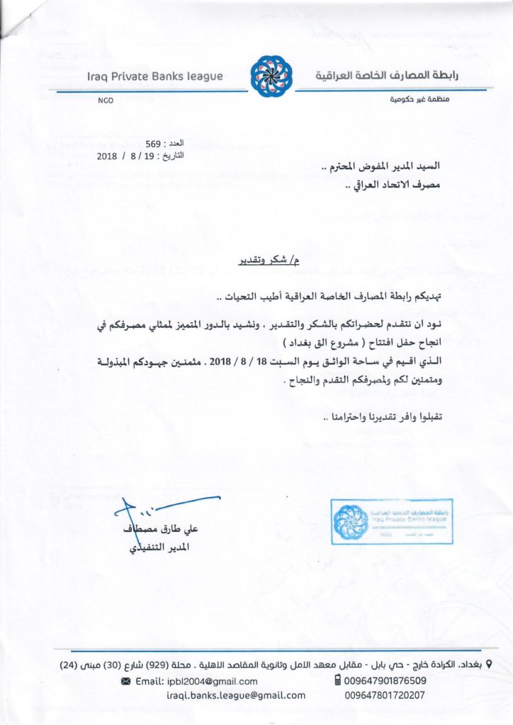 قدمت رابطة المصارف العراقية شكر وتقدير الى مصرف الاتحاد العراقي لمساهمة المصرف في مشروع الق بغداد والدور المميز لممثلي المصرف في انجاح افتتاح المشروع والذي اقيم السبت 18/8/2018 الناشر: Mustafa